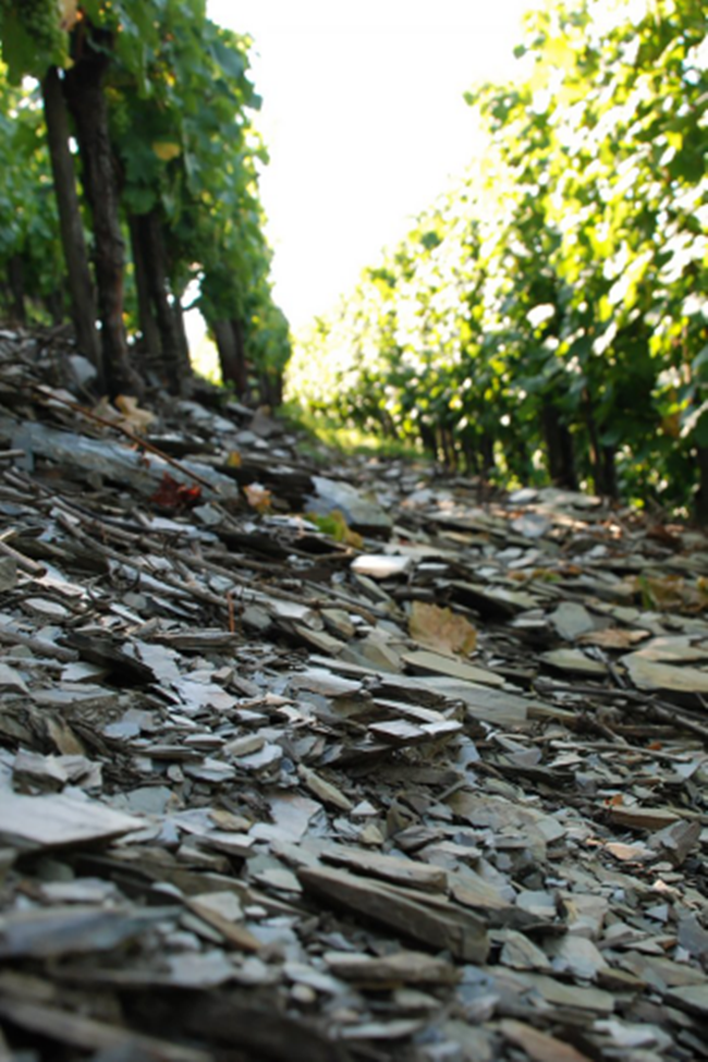 德國摩澤爾產(chǎn)區(qū)以出產(chǎn)優(yōu)質(zhì)的雷司令(Riesling)葡萄酒見長,其葡萄園里的土壤大多為藍(lán)色板巖和紅色板巖。這兩種土壤都較為貧瘠,擁有良好的排水性,在潮濕的生長季能防止葡萄根系因積水而腐爛。同時,它們的儲熱性也十分優(yōu)秀,即使是在涼爽的年份,也能幫助葡萄藤順利成熟。此外,板巖土壤中富含酵母與細(xì)菌等微生物,產(chǎn)自這種土壤的雷司令葡萄酒往往帶有獨特的礦物質(zhì)風(fēng)味。