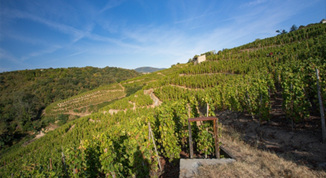 維歐尼是孔得里約產區唯一的法定品種,在這里有著悠久的種植歷史。這一品種果皮厚,酸度較低,培育難度較大,需要大量陽光才能成熟,然而陽光和熱量過多,又會使葡萄酒酒精度過高,缺乏清新感。同時,維歐尼葡萄酒中的許多香氣需要在發酵過程中酒精度達13%abv之后才能發展出來,因此需要十分注意葡萄的采摘時間并嚴格把控酒精發酵的進程,以釀出風味豐富美妙、同時兼具清新感的佳釀。