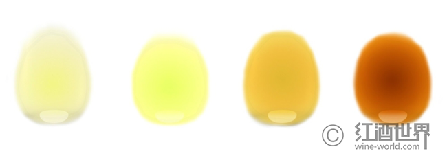 對于白葡萄酒來說,酒液中的單寧含量極少,因而在陳年時幾乎是一個純粹氧化的過程,顏色在這一過程中會逐漸變得深濃,由檸檬色或淺綠色轉(zhuǎn)為金黃色,繼而轉(zhuǎn)變?yōu)殓晟?/span>