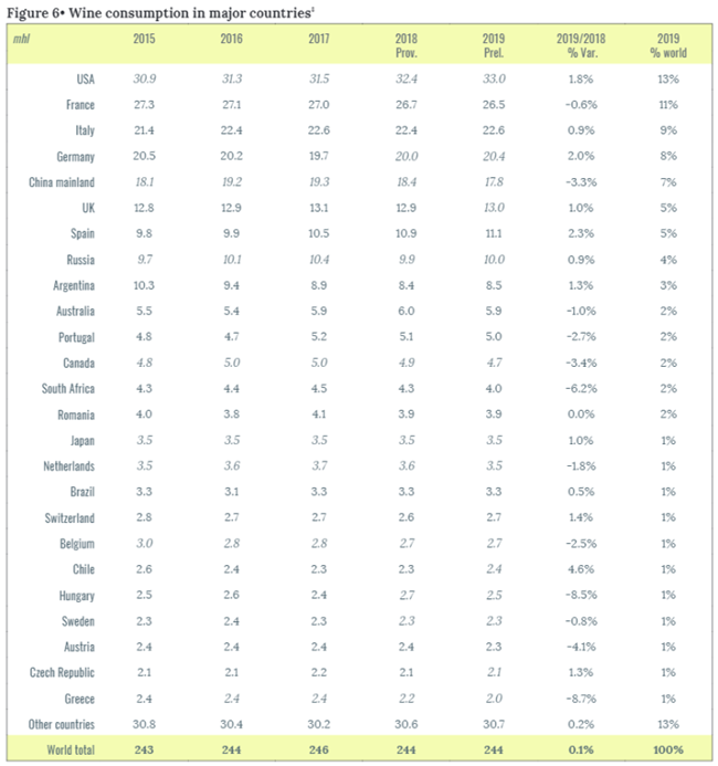 2019年世界葡萄酒消費量估計為244 百萬升,與2018年相比增加了0.1%。