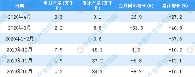 據中商產業研究院數據庫顯示,2020年4月全國葡萄酒產量為3.3萬千升,同比增長26.9%。2020年1-4月全國葡萄酒產量為9.1萬千升,同比下降27.2%。
