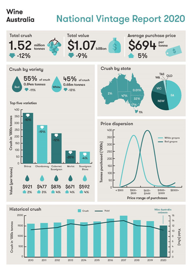 根據(jù)澳大利亞葡萄酒管理局在今天(7月7日)發(fā)布的2020年《全國釀酒葡萄收獲報告》(National Vintage Report)顯示,2020年澳大利亞的釀酒葡萄收成(壓榨)產(chǎn)量約152萬噸,相當于超過10億升的葡萄酒。