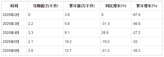 2020年1-6月全國葡萄酒產量分月數據