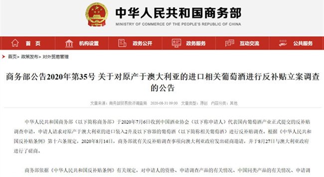 自本公告發(fā)布之日起,商務部對原產于澳大利亞的進口相關葡萄酒進行反補貼立案調查,本次調查確定的補貼調查期為2019年1月1日至2019年12月31日,產業(yè)損害調查期為2015年1月1日至2019年12月31日。