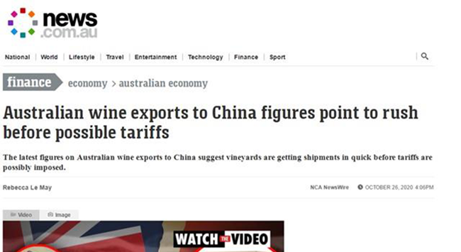 澳新網(wǎng)報道,根據(jù)澳洲葡萄酒機構(WA),2019年9月至2020年9月,澳洲出口至中國(包括中國香港、澳門地區(qū))的葡萄酒價值達到了創(chuàng)造紀錄的125億元。