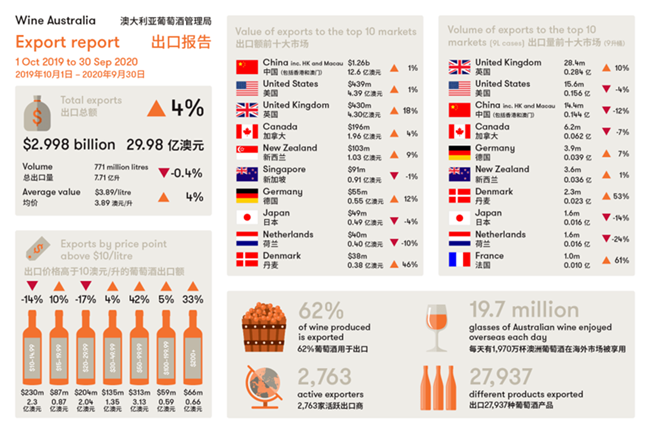 在截至2020年9月的一個財年,澳大利亞出口商將澳洲葡萄酒出口至117個目的地市場。最顯著的漲幅出現在歐洲(增長16%至6.78 億澳元),這是自2011年以來首次在出口額上超越了北美。