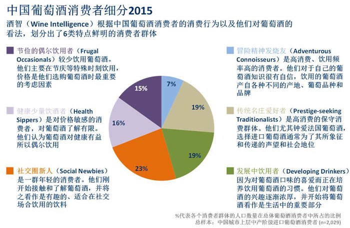 在2015年的研究中,發現了在2012年尚未出現的消費者群體:“發展中飲用者”(Developing Drinkers),他們通常是年齡接近30歲或30歲出頭的持有大學學歷的高薪白領,最初在商務飯局等場合開始接觸葡萄酒,如今把飲用葡萄酒的習慣帶到日常生活和工作外的社交場合中。