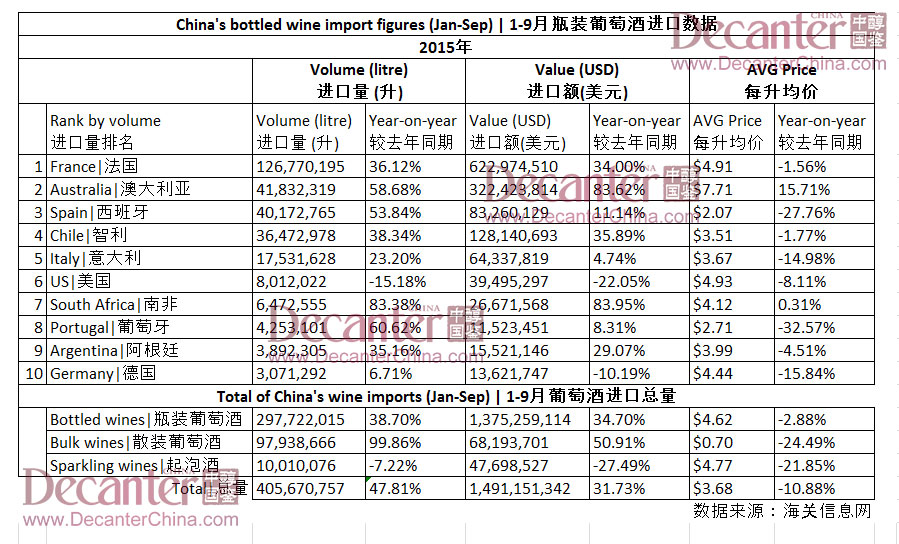 根據海關發布的數據顯示,今年一月到九月,中國市場瓶裝葡萄酒進口量同比上升38.7%,達3.0億升,進口額上升34.7%,達14億美元。其中,法國和澳大利亞葡萄酒進口增長顯著。這表示,中國進口葡萄酒市場在2015年前三季度強勢回暖。