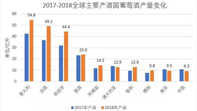 據OIV數據顯示,2018年全球葡萄酒產量292.3億升,較2017年增加了17%。排名前十的國家分別是:意大利54.8億升、法國49.1億升、西班牙44.4億升、美國23.9億升、阿根廷14.5億升、智利12.9億升、澳大利亞12.9億升、德國9.8億升、南非9.5億升、中國9.3億升。