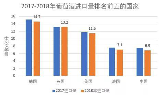 2018年葡萄酒進口排名前五的國家分別是德國(14.7億升)、英國(13.2億升)、美國(11.5億升)、法國(7.1億升)和中國(6.9億升),占2018年全球葡萄酒進口量的一半以上。