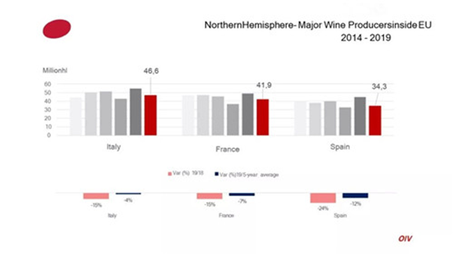 包括法國、意大利、西班牙在內(nèi)的葡萄酒主產(chǎn)國產(chǎn)量均有不同程度下降。OIV的數(shù)據(jù)來自28個(gè)國家,占全球葡萄酒產(chǎn)量的85%。