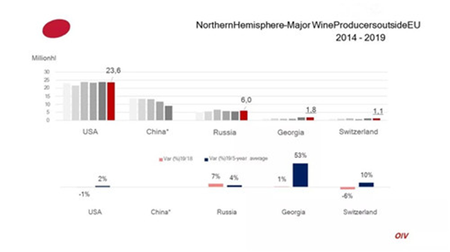 據(jù)國際葡萄與葡萄酒組織(OIV)最新數(shù)據(jù)顯示,2019年全球葡萄酒產(chǎn)量為263億升(mhl),同比2018年下降了10.54%。