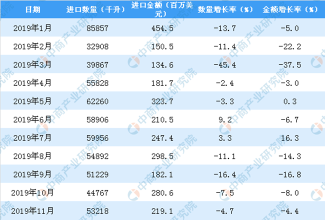 據中商產業研究院數據庫顯示,2014-2017年中國葡萄酒進口量逐漸增長,2018年中國葡萄酒進口量有所下降;2019年1-11月中國葡萄酒進口量為599355千升,同比下降10.6%。